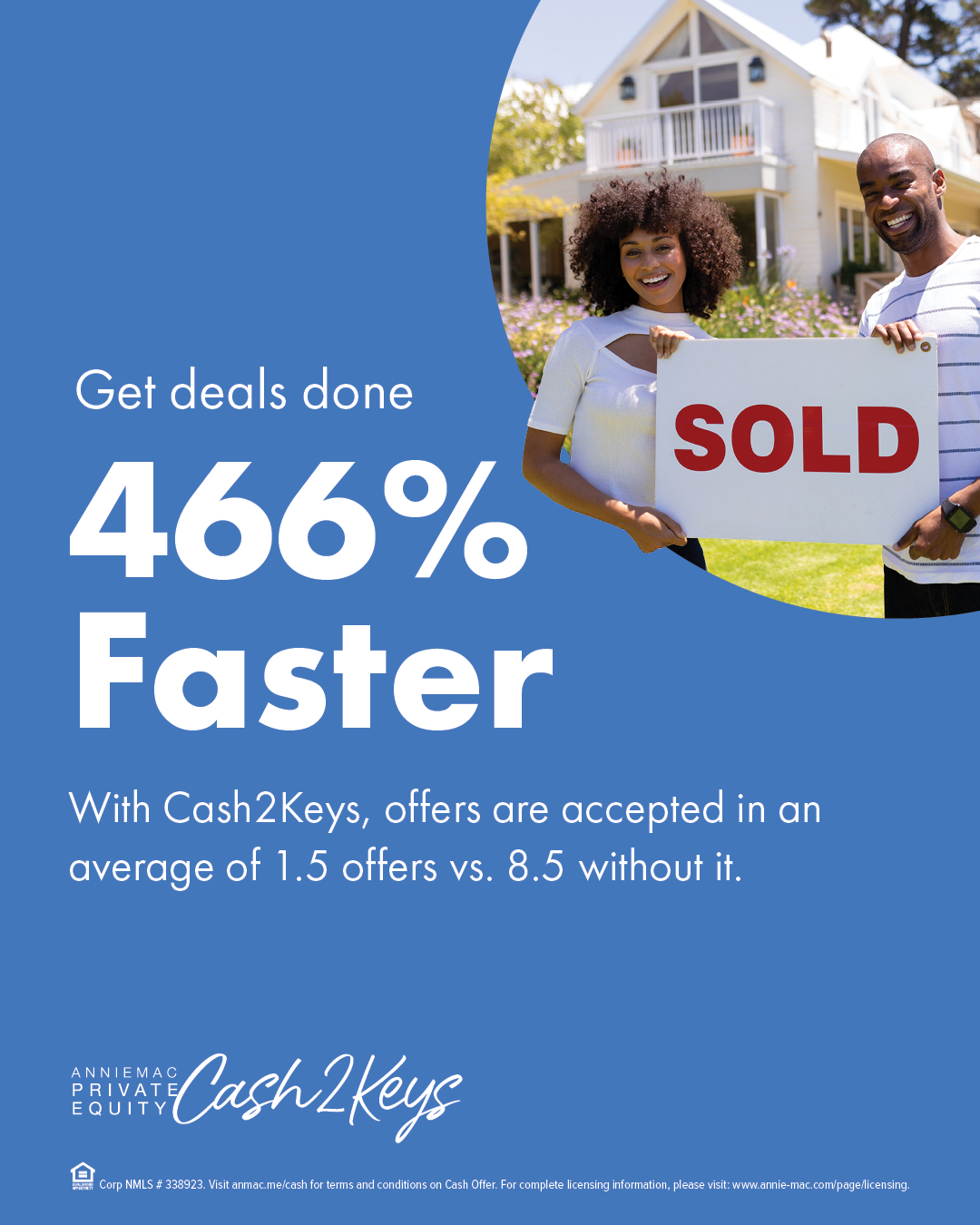Unlock your clients’ equity before they sell! Cash2Keys Cash Bridge gives them the funds to buy their next home first—no contingencies, no delays.